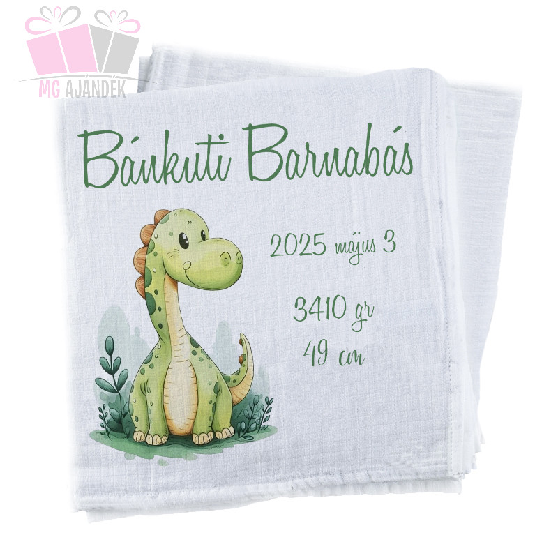Igazán egyedi ajándék pl babalátogatóba, vagy baba születésekor ez a sűrű szövésű dínós textilpelenka, melyre kérheted a baba nevét, születési adatait, vagy éppen egy kedves üzenetet.